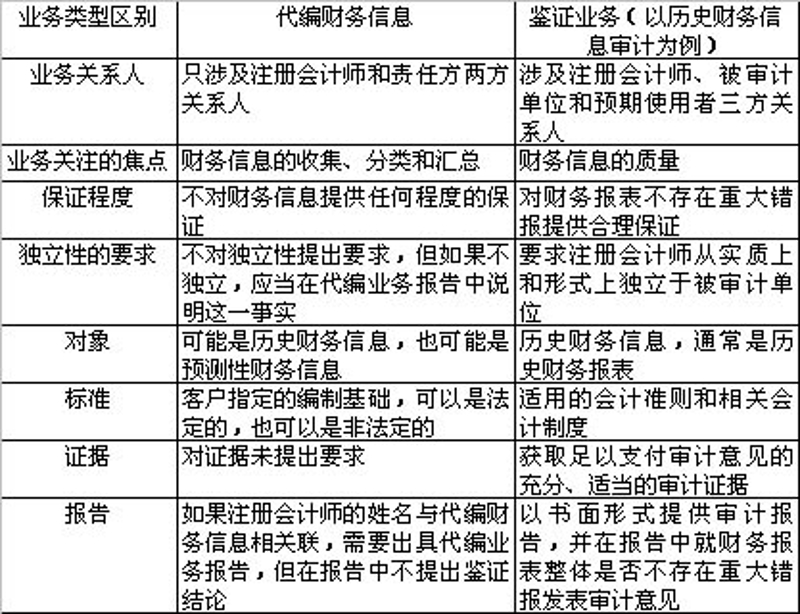 表4111-1 列示了代编业务与鉴证业务的区别。