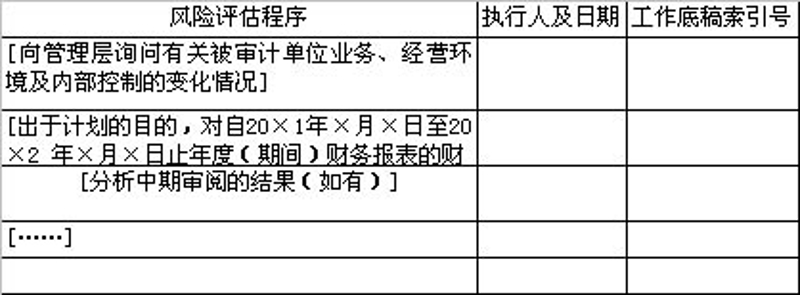 目 录① 1、风险评估程序 1.1 一般风险评估程序 1.2 针对特定项目的程序 2、了解被审计单位及其环境(不包括内部控制) 2.1 行业状况、法律环境与监管环境以及其他外部因素 2.2 被审计单位的性质 2.3 会计政策的选择和运用 2.4 目标、战略及相关经营风险 2.5 财务业绩的衡量和评价 3、了解内部控制 3.1 控制环境 3.2 被审计单位的风险评估过程 3.3 信息系统与沟通 3.4 控制活动 3.5 对控制的监督 4、对风险评估及审计计划的讨论 5、评估的重大错报风险 5.1 评估的财务报表层次的重大错报风险 5.2 评估的认定层次的重大错报风险 6、计划的进一步审计程序 6.1 重要账户或列报的计划总体方案(计划矩阵) 6.2 计算机辅助审计技术的应用 7、其他程序 1、风险评估程序 1.1 一般风险评估程序 项目组需记录为了解被审计单位及其环境所执行的风险评估程序。该程序可能包括询问、观察、检查及分析程序等。所记录的内容需要包括项目组工作的性质及范围。