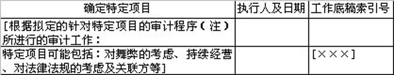 6、计划的进一步审计程序 重要账户或列报的计划总体方案(计划矩阵)(接上述5.2部分举例) 以下表格的目的是列示如何针对评估的认定层次的重大错报风险,设计进一步审计程序的总体方案。本表的结果将影响进一步审计程序的内容和结构。 记录以下内容: ●确定重要账户及列报; ●将评估的认定层次的重大错报风险与重要账户或列报相联系; ●对重要账户或列报确定相关认定; ●确定审计目标,并与进一步审计程序表中的相关审计目标相互索引; ●评估是否利用专家及其他人士的工作; ●确定拟实施的总体方案及是否实施控制测试和实质性程序; ●与进一步审计程序表的具体审计程序相互索引。 [审计目标编号1:应收账款的存在、完整性及计价和分摊,及收入的发生、完整性、截止及准确性] [审计目标编号2:坏帐准备的计价和分摊,及管理费用-坏帐的准确性] [注1:对本表的总体说明: 重要账户或列报至少包括上述5.2部分中列示识别出的与重大错报风险相关的账户及列报。 此外,由于《中国注册会计师审计准则第1321号-针对评估的重大错报风险实施的程序》第五十五条的规定,即“注册会计师对重大错报风险的评估是一种判断,可能无法充分识别所有的重大风险,并且由于内部控制存在固有局限性,无论评估的重大错报风险结果如何,注册会计师都应当针对所有重大的各类交易、账户余额、列报实施实质性程序”,一般注册会计师也根据具体情况(如依据某一标准)确定列示于”重要账户或列报”的范围,以扩大本计划矩阵涵盖的范围并确定其审计程序。 为便于将本表与资产负债表及利润表相对照,注册会计师也可以将资产负债表及利润表中所有项目列示于本表 ,但此时注册会计师可能对某些影响非常小的账户及列报拟不实施进一步审计程序,此时可以在相关认定的“无”一栏中注明“√”以作标识 ] [注 2:以下是对相关认定的进一步解释: • 确定重要账户和列报的相关认定。需要说明的是: — 某些认定是与第 5.2 部分列示的认定层次的重大错报风险相联系的,此时应当填列相关风险编号(如上述表格中编号“a”的风险),以表明与第 5.2 部分的重大错报风险相互索引。 — 除与第 5.2 部分相联系的相关认定外,如果注册会计师认为有必要执行审计程序,以确定其他认定不存在重大错报,可以在本矩阵中以“是”列示。] [注 3:以下是对审计目标的进一步解释: • 审计目标:可以将重要账户及列报与认定相联系,确定审计目标。 • 注册会计师通常将与某类交易相关的所有重要账户和列报,以及相关认定联系,汇总确定为一个审计目标。 • 通常,注册会计师针对每一个审计目标设计一套进一步审计程序。审计目标决定进一步审计程序表中包括的账户和列报结构,因此恰当的组合重要账户和列报与认定可以帮助注册会计师采取有效的审计方案。 • 值得注意的是,由于有时可能会对某一重要账户或列报确定不同的审计目标,因此可以将该重要账户和列报细化,比如本矩阵中将应收账款账面价值分应收账款余额及坏账准备两项列示,并分别定义相关认定及审计目标。] [注 4:以下是对具体审计程序的进一步解释: 具体审计程序列示于“进一步审计程序表”(见索引号为[×××]的审计工作底) 在实务中,注册会计师通常单独编制一套“进一步审计程序表”,并与具体审计计划中的“进一步审计程序的计划总体方案”相互索引。待具体实施审计程序时,注册会计师将基于所计划的具体审计程序,进一步记录所实施的审计程序及结果,并最终形成有关进一步审计程序的审计工作底稿。] 计算机辅助审计技术的应用 对于以电子形式存在的信息,注册会计师可以通过使用计算机辅助审计技术实施某些审计程序①,本部分是对以上 6.1 部分的补充。 以下记录使用的计算机辅助审计技术所对应的会计科目、审计目标及具体程序。
