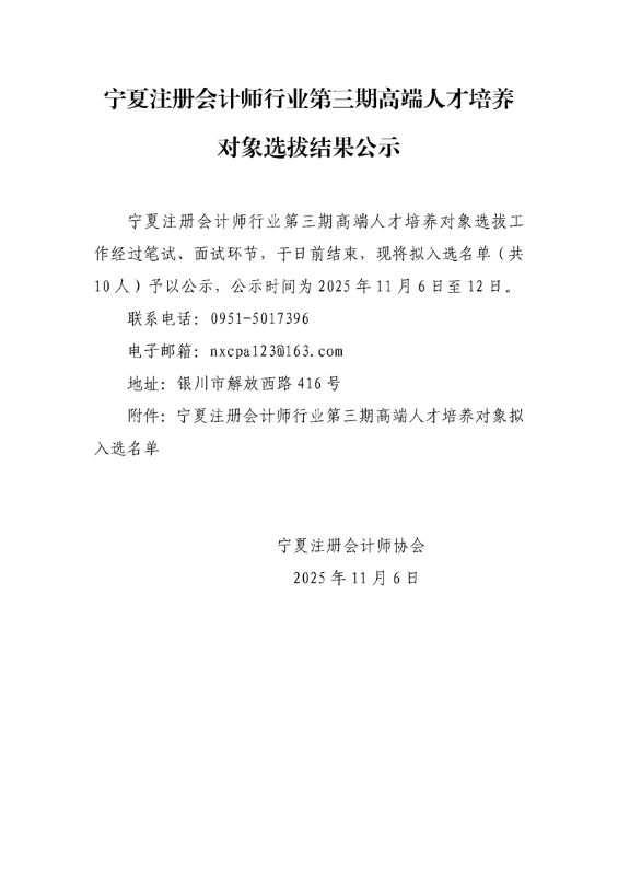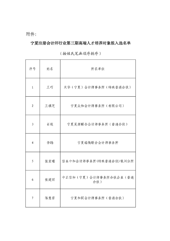 宁夏注册会计师行业第三期高端人才培养对象选拔结果公示